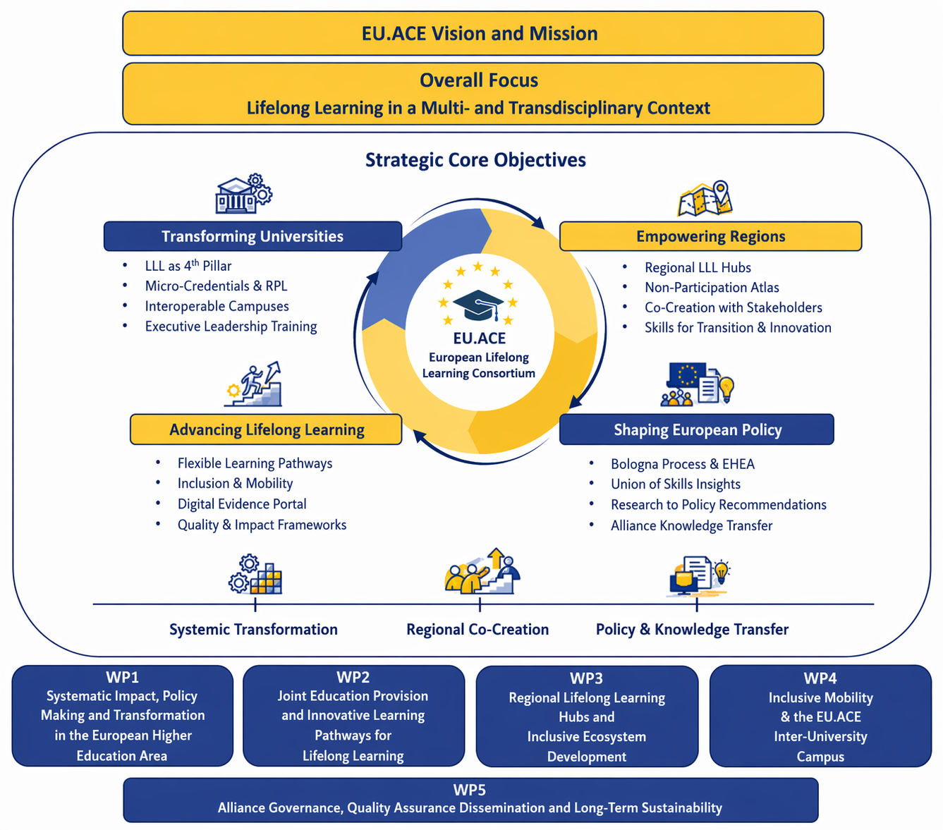 EU.ACE is transforming our universities into multi-varsities that embrace multi-disciplinarity, multi-lingualism and multi-stakeholder involvement while keeping academic freedom and democratic values as enablers to fulfil our joint missions and to create a European University for Academic Continuing Education. In this environment, challenge-driven universities with a core vision of innovative research-based teaching methodologies and inclusive lifelong learning education work together to co-create a consortium with strong links to our local economic, social and geographical environments and an orientation toward global challenges.